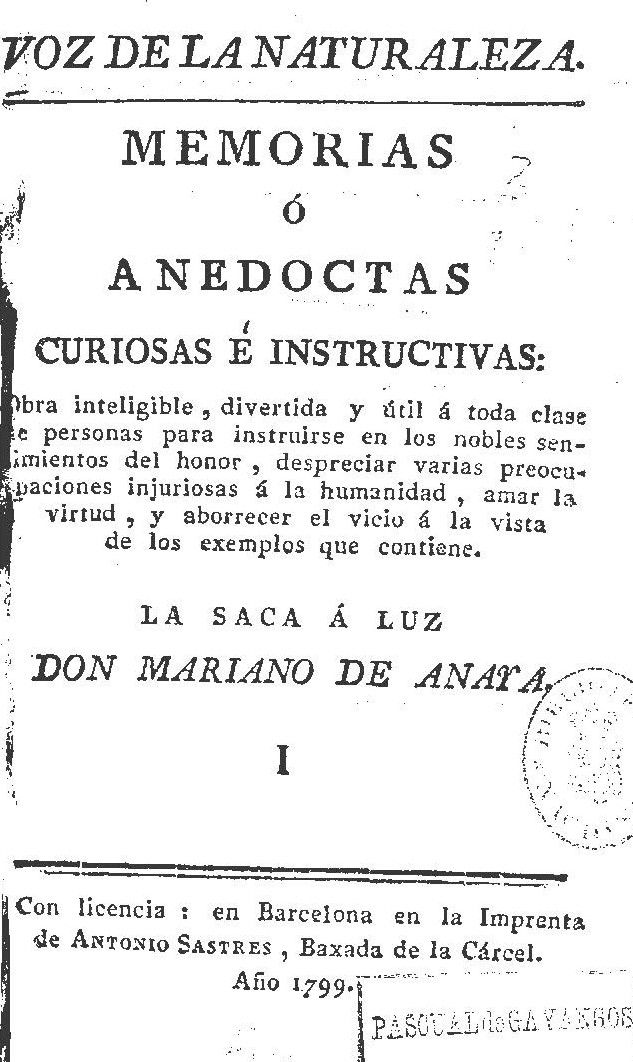 Voz de la Naturaleza. Memorias ó Anecdotas curiosas è instructivas. Obra inteligible, divertida y útil á toda clase de personas para instruirse en los nobles sentimientos del honor, despreciar varias preocupaciones injuriosas á la humanidad, amar la virtud, y aborrecer el vicio á la vista de los exemplos que contiene.1799 BT: 2600 Standort: London - British Library Signatur: 12490.a.19.
