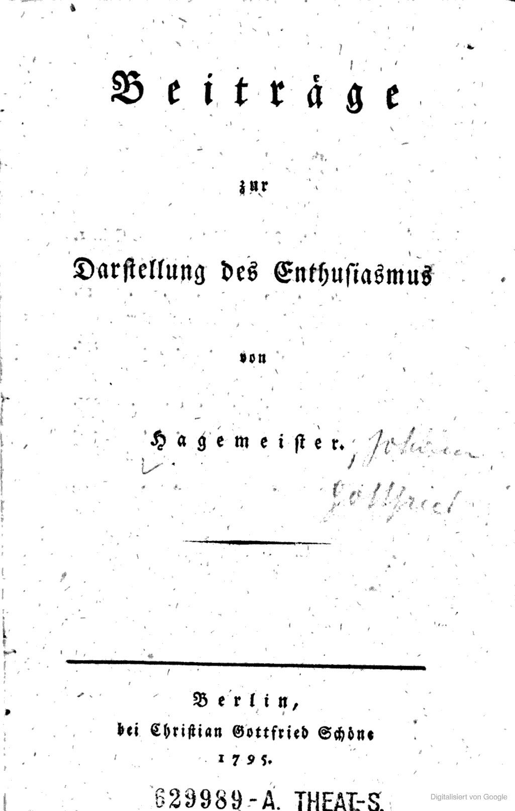 Beiträge zur Darstellung des Enthusiasmus.1795 BT: 7029 Standort: London - British Library Signatur: 11746.b.23.