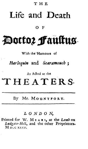 The life and death of Doctor Faustus. With the humours of Harlquin and Scaramouch; as acted at the theatre.1735 BT: 7894 Standort: Stuttgart - Württembergische Landesbibliothek Signatur: Fr.D.oct.997