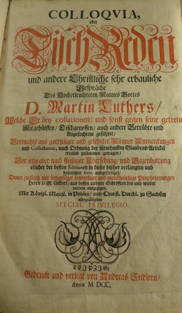Colloquia, oder Tisch-Reden und andere christliche sehr erbauliche Gespräche. Welche Er bey collationen, und sonst gegen seine getreue Mitgehülffen, Tischgenossen, auch andere Betrübte und Angefochtene geführet, Vormahls aus gottseliger und gelehrter Männer Anmerckungen und Collectaneis, nach Ordnung der fuernehmsten Glaubens-Artickel treulich zusammen getragen, Vor ietzo aber nach fleißiger Ubersehung, und Gegenhaltung etlicher der besten Editionen in dieser bißher verlangten und bequemen form ausgefertiget, Denen zugleich mit beygefüget sonderbare und merckwürdige Prophezeyungen...1700 BT: 872 Standort: London - British Library Signatur: 1226.i.9.