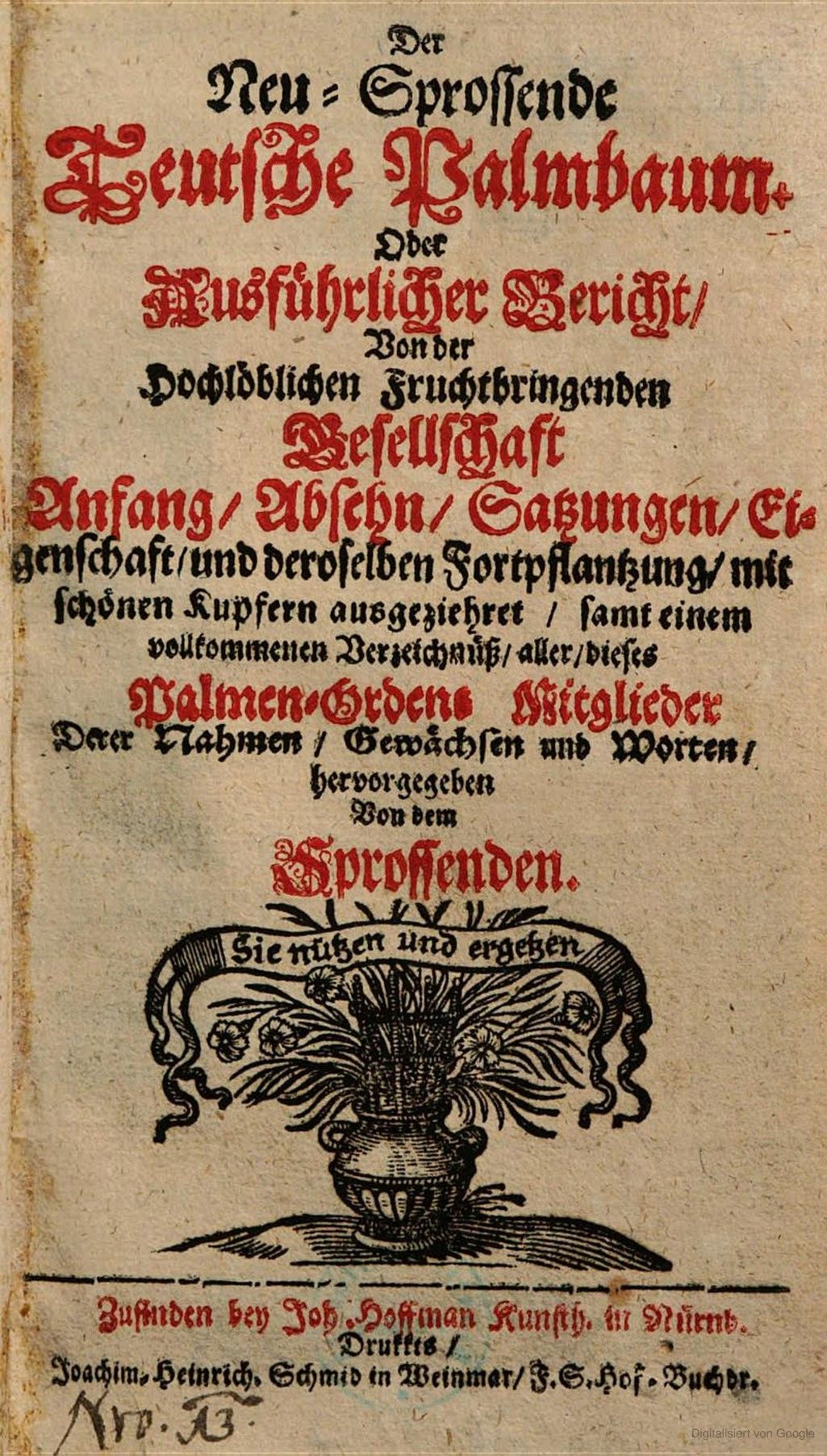Der Neu-Sprossende Teutsche Palmbaum Oder ausführlicher Bericht von der hochlöblichen Fruchtbringenden Gesellschaft Anfang, Absehn, Satzungen, Eigenschaft, und deroselben Fortpflanzung. Mit schönen Kupfern ausgeziehet, samt einem vollkommenen Verzeichnüß aller dieses Palmen-Ordens Mitglieder Derer Nahmen, Gewächsen und Worten, hervorgegeben von dem Sprossenden.[1668] BT: 987 Standort: London - British Library Signatur: 1091.a.37.