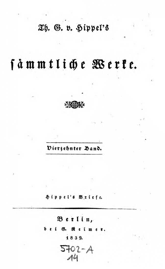 Sämmtliche Werke. Hippel's Leben.1835 BT: 604 Standort: Wien – Österreichische Nationalbibliothek (ÖNB) Signatur: 5702-A.12