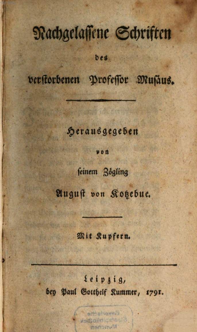 Nachgelassene Schriften des verstorbenen Professor Musäus. Herausgegeben von seinem Zögling.1791 BT: 968