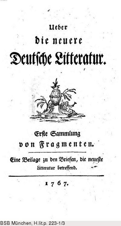 Ueber die neuere deutsche Literatur. Eine Beilage zu den Briefen die neueste Literatur betreffend.1767 BT: 6885