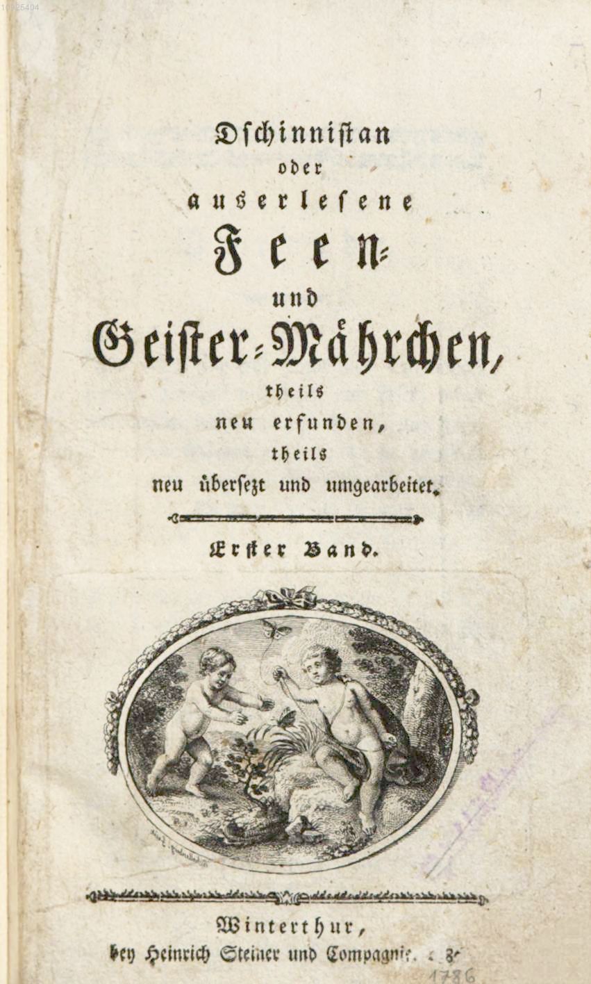 Dschinnistan, oder auserlesene Feen- und Geister-Mährchen. Theils neu erfunden, theils neu übersezt und umgearbeitet.1786 BT: 2369 Standort: London - British Library Signatur: 12410.d.9.