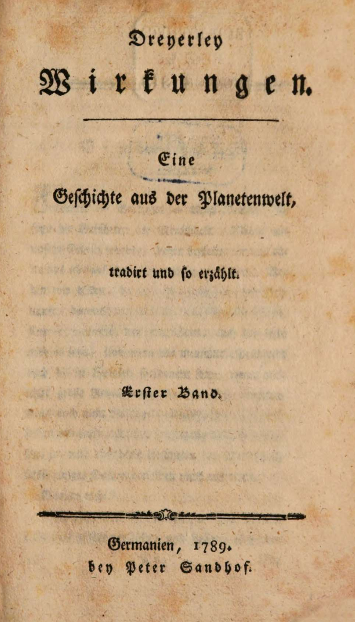Dreyerley Wirkungen. Eine Geschichte aus der Planetenwelt, tradirt und so erzählt.1789 BT: 22 Standort: London - British Library Signatur: 12547.b.27.