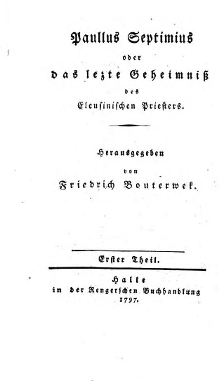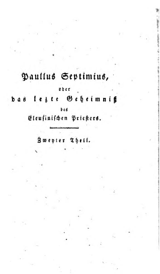 Paullus Septimius oder das lezte Geheimniß des eleusinischen Priesters.1797 BT: 4877 Standort: London - British Library Signatur: 8465.a.33.