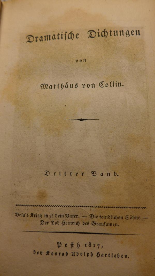 Dramatische Dichtungen. Bela’s Krieg mit dem Vater. - Die feindlichen Söhne. - Der Tod Heinrich des Grausamen.1817 BT: 239 Standort: London - British Library Signatur: 11746.a.16