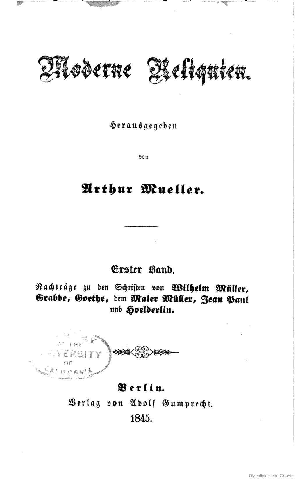 Moderne Reliquien. Nachträge zu den Schriften von Wilhelm Müller, Grabbe, Goethe, dem Maler Müller, Jean Paul und Hoelderlin.1845 BT: 465 Standort: London - British Library Signatur: 12251.c.13.