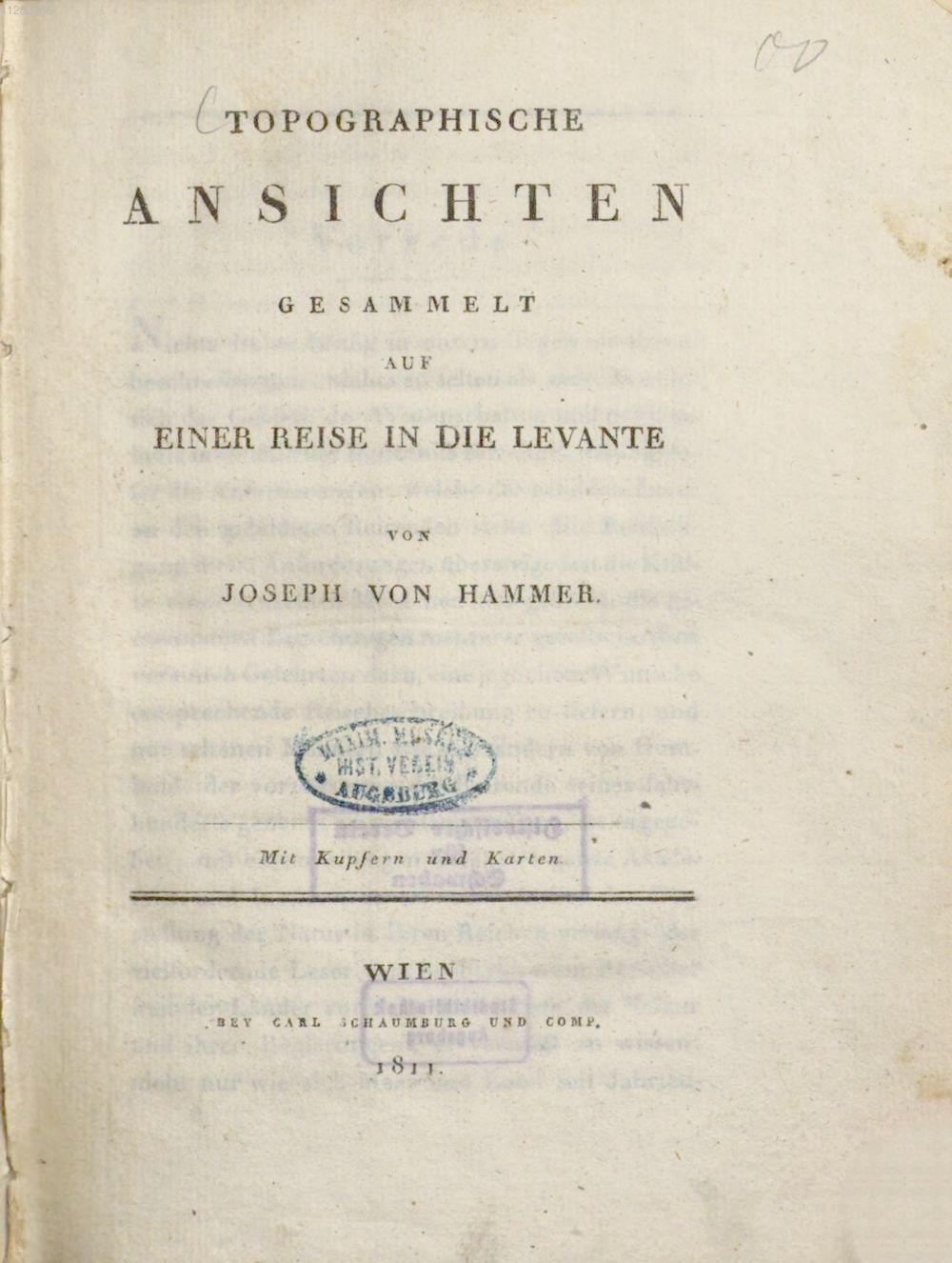 Umblick auf einer Reise von Constantinopel nach Brussa und dem Olympos und von da zurück über Nicäa und Nicomedien. Mit Kupfern, Karten und Inschriften.1818 BT: 5435 Standort: Stuttgart - Württembergische Landesbibliothek Signatur: Geogr.oct.2809