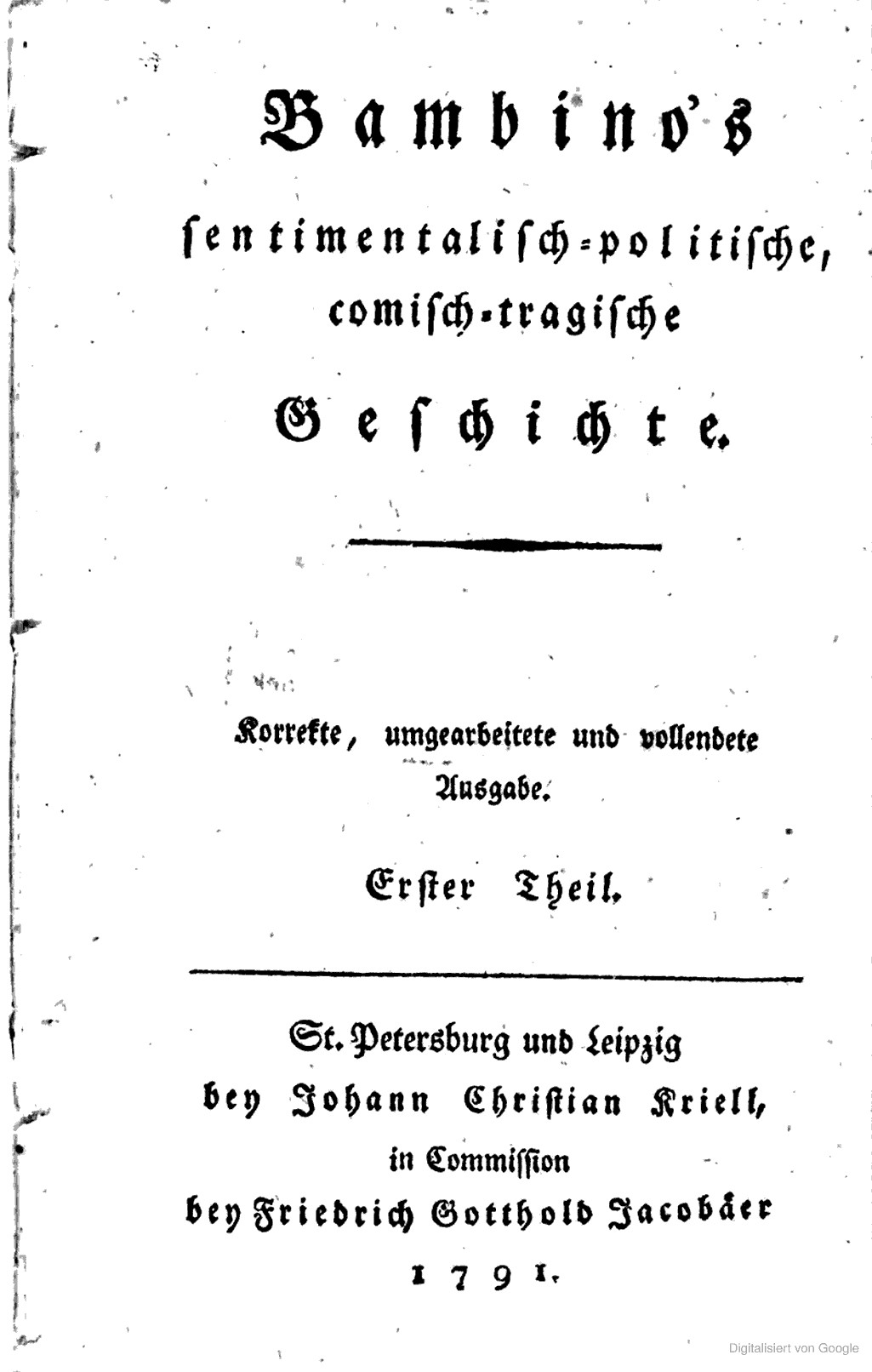 Bambino's sentimentalisch-politische, comisch-tragische Geschichte. Korrekte, umgearbeitete und vollendete Ausgabe.1791 BT: 699 Standort: London - British Library Signatur: 12548.d.3.