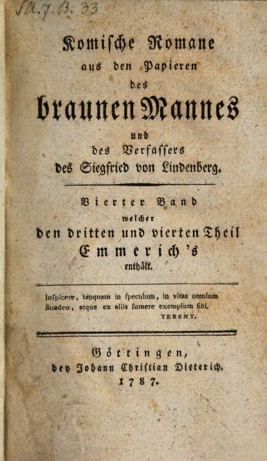 Komische Romane aus den Papieren des braunen Mannes und des Verfassers des Siegfried von Lindenberg. Emmerich, eine komische Geschichte.1788 BT: 954 Standort: Wien – Österreichische Nationalbibliothek (ÖNB) Signatur: 28070-A.5