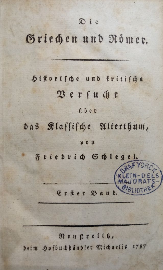Die Griechen und Römer. Historische und kritische Versuche über das Klassische Alterthum.1797 BT: 6327 Standort: Breslau - Universitätsbibliothek Wrocław Signatur: .037928