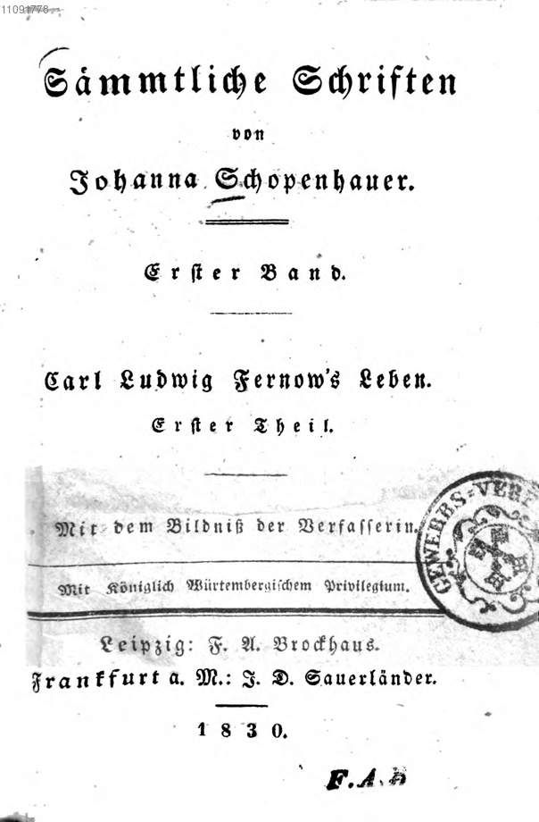 Sämmtliche Schriften. Erster Band. Carl Ludwig Fernow’s Leben. Erster Theil. Mit dem Bildniß der Verfasserin.1830 BT: 1283 Standort: Wien – Österreichische Nationalbibliothek (ÖNB) Signatur: 5682-A.1