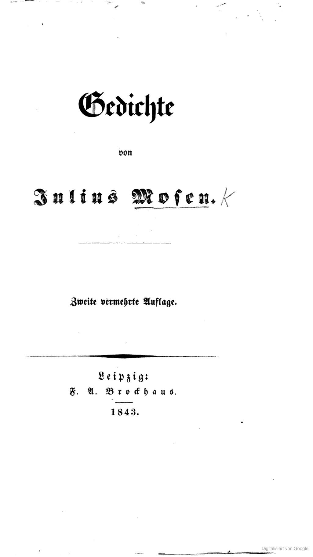 Gedichte von Julius Mosen.1836 BT: 931 Standort: Wien – Österreichische Nationalbibliothek (ÖNB) Signatur: 5654-A