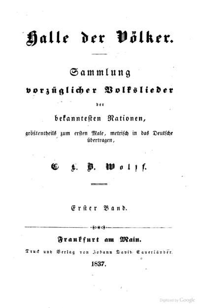 Halle der Völker. Sammlung vorzüglicher Volkslieder der bekanntesten Nationen, grösstentheils zum ersten Male, metrisch in das Deutsche übertragen.1837 BT: 1576 Standort: London - British Library Signatur: 11521.b.32.