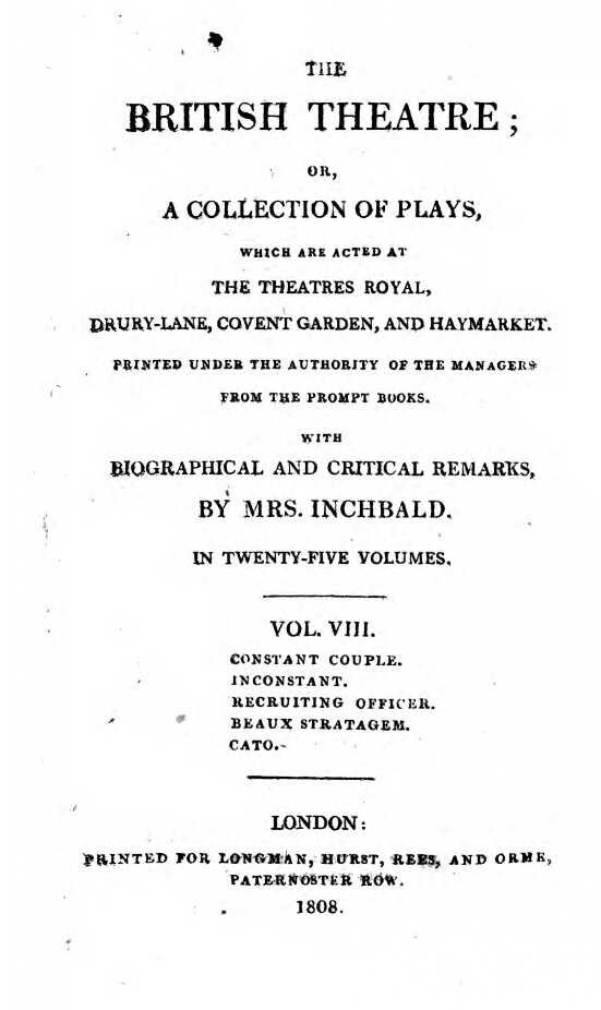 The British Theatre, or, a Collection of Plays, which are acted at the Theatres Royal, Drury Lane, Covent Garden, and Haymarket. Printed under authority of the managers from the prompt books. With biographical and critical remarks. In twenty-five Volumes.1808 BT: 2316 Standort: Wien – Österreichische Nationalbibliothek (ÖNB) Signatur: 24054-A.1,1 ; 24054-A.1,2 ; 24054-A.1,3 ; 24054-A.1,4 ; 24054-A.1,5