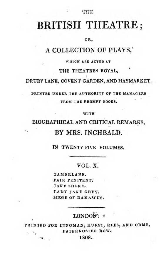 The British Theatre, or, a Collection of Plays, which are acted at the Theatres Royal, Drury Lane, Covent Garden, and Haymarket. Printed under authority of the managers from the prompt books. With biographical and critical remarks. In twenty-five Volumes.1808 BT: 2316 Standort: Wien – Österreichische Nationalbibliothek (ÖNB) Signatur: 24054-A.9,1 ; 24054-A.9,2 ; 24054-A.9,3 ; 24054-A.9,4 ; 24054-A.9,5