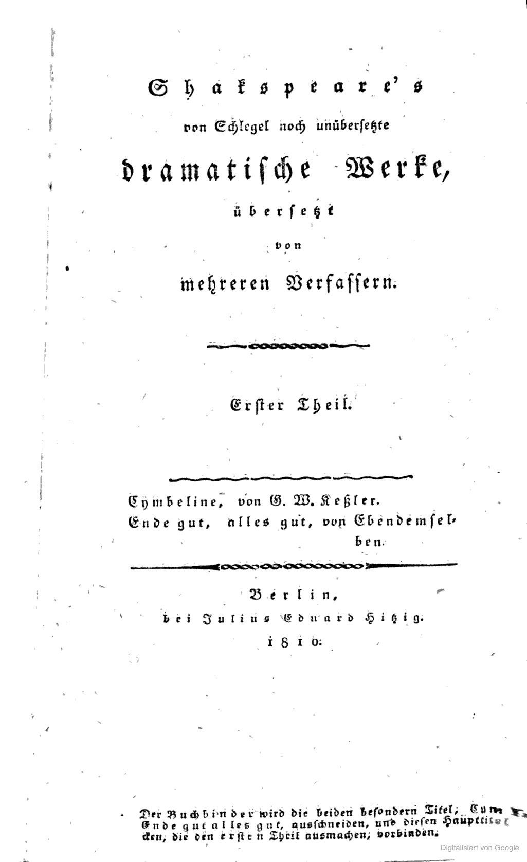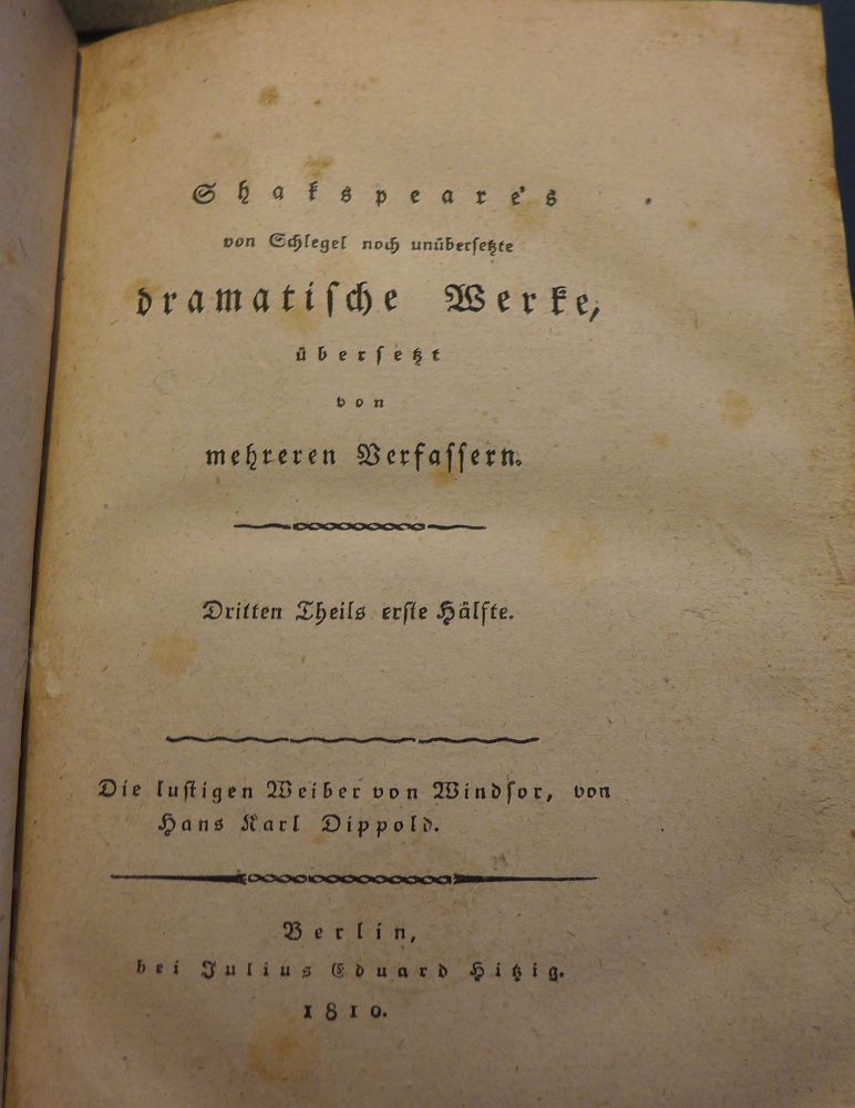 Von Schlegel noch unübersetzte dramatische Werke. Übersetzt von mehreren Verfassern.1810 BT: 2183 Standort: London - British Library Signatur: 11762.e.8.