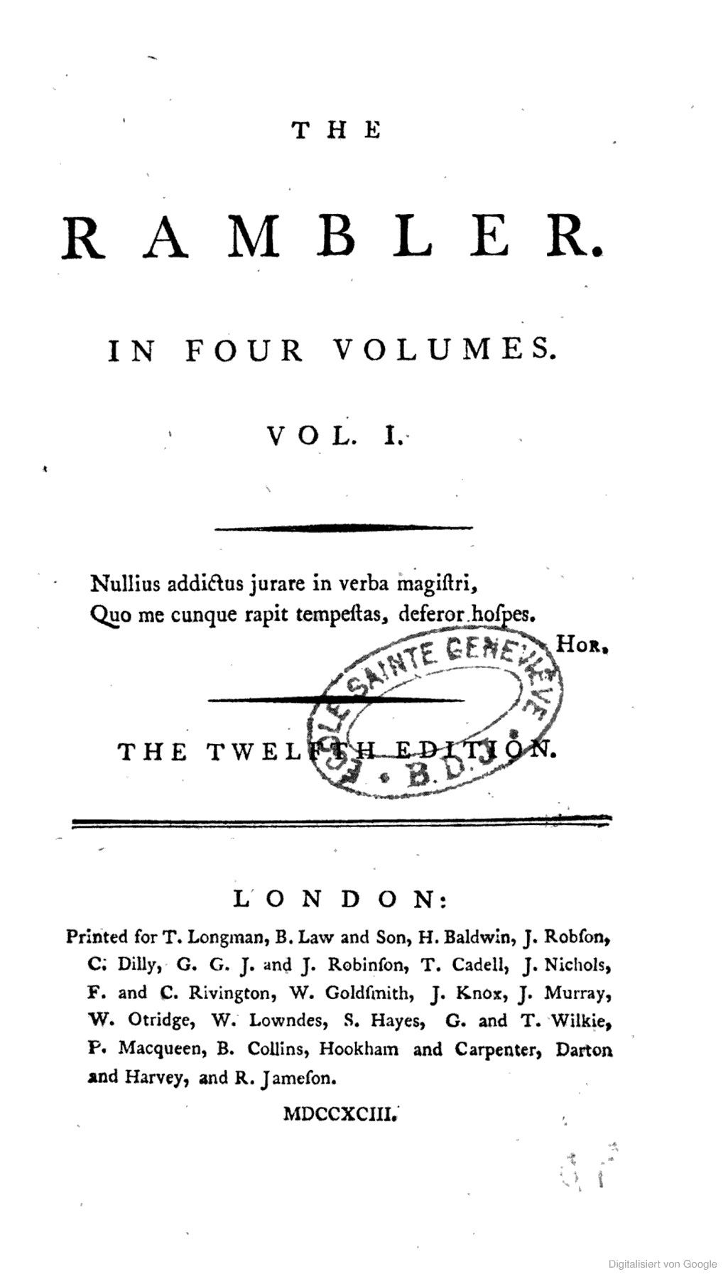 The lives of the most eminent English poets. With critical observations on their works.1781 BT: 5558 Standort: Breslau - Universitätsbibliothek Wrocław Signatur: 035490