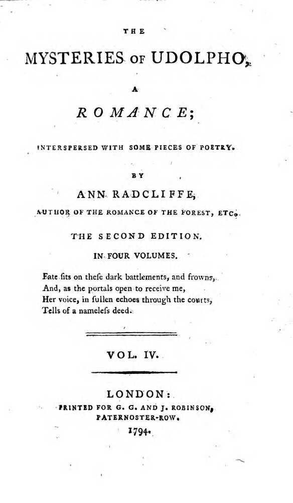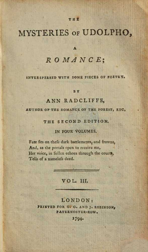 The Mysteries of Udolpho. A Romance; interspersed with some pieces of poetry ; By Ann Radcliffe, author of the romance of the forest, etc.1794 BT: 2077 Standort: Wien – Österreichische Nationalbibliothek (ÖNB) Signatur: 23997-B.4