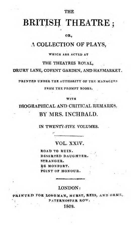 The British Theatre, or, a Collection of Plays, which are acted at the Theatres Royal, Drury Lane, Covent Garden, and Haymarket. Printed under authority of the managers from the prompt books. With biographical and critical remarks. In twenty-five Volumes.1808 BT: 2316 Standort: Wien – Österreichische Nationalbibliothek (ÖNB) Signatur: 24054-A.24,1 ; 24054-A.24,2 ; 24054-A.24,3 ; 24054-A.24,4 ; 24054-A.24,5