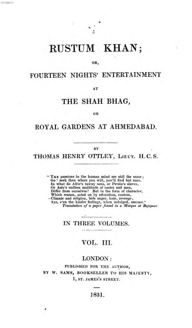 Rustum Khan. Or, Fourteen nights entertainment at the Shah Bhag, or Royal gardens at Ahmedabad.1831 BT: 2033 Standort: München - Bayerische Staatsbibliothek (BSB) Signatur: P.o.angl. 269 t-3
