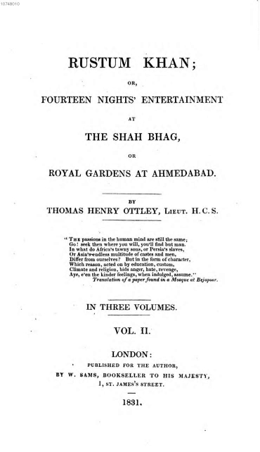 Rustum Khan. Or, Fourteen nights entertainment at the Shah Bhag, or Royal gardens at Ahmedabad.1831 BT: 2033 Standort: München - Bayerische Staatsbibliothek (BSB) Signatur: P.o.angl. 269 t-2