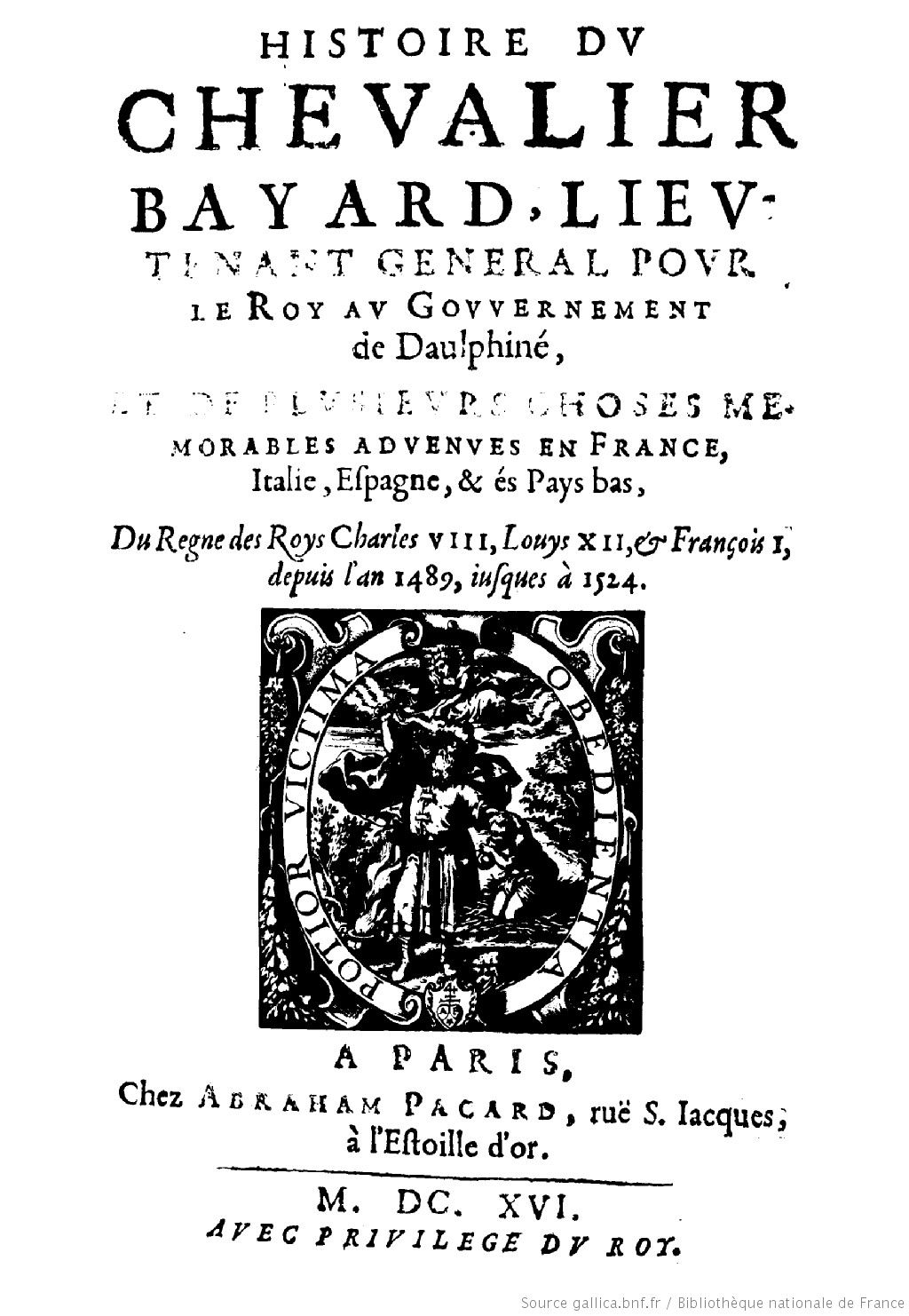 Histoire du chevalier Bayard lieutenant générale pour le Roy au Gouvernement de Daulphiné, et de plumier choses memorables advenues en France, Italie, Espagne et Paysbas.