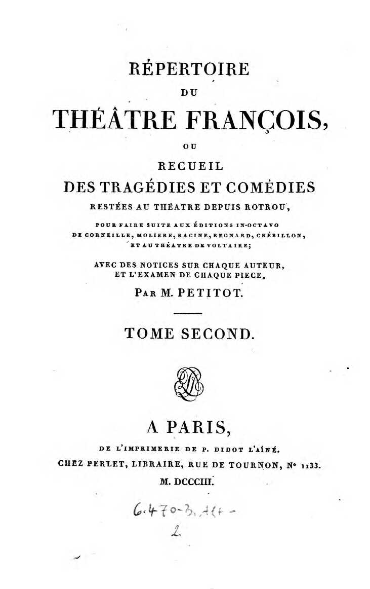 Répertoire du Théâtre François, ou Recueil des Tragédies et Comédies restées au Théatre depuis Rotrou, pour faire suite aux Éditions in-octavo de Cornéille, Moliere, Racine, Regnard, Crébillon, et au Théatre de Voltaire. Avec des Notices sur chaque Auteur, et l’Examen de chaque Piece. Tome Second. Tragédies.1803 BT: 3245 Standort: Wien – Österreichische Nationalbibliothek (ÖNB) Signatur: 6470-B.2