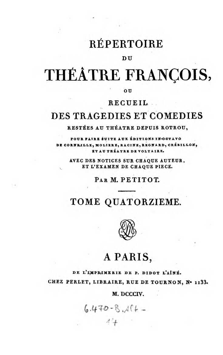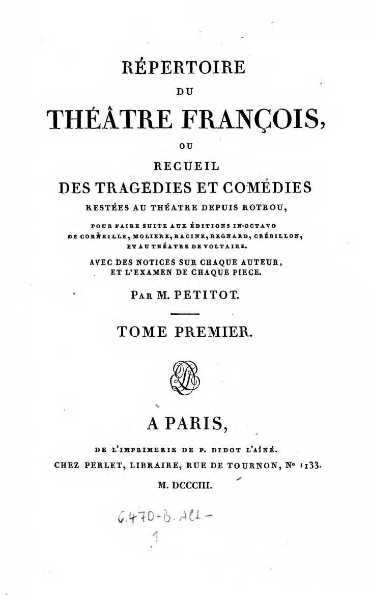 Répertoire du Théâtre François, ou Recueil des Tragédies et Comédies restées au Théatre depuis Rotrou, pour faire suite aux Éditions in-octavo de Cornéille, Moliere, Racine, Regnard, Crébillon, et au Théatre de Voltaire. Avec des Notices sur chaque Auteur, et l’Examen de chaque Piece. Tome Premier. Tragedies.1803 BT: 3245 Standort: Wien – Österreichische Nationalbibliothek (ÖNB) Signatur: 6470-B.1
