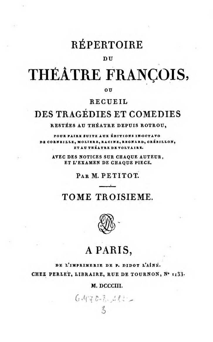 Répertoire du Théâtre François, ou Recueil des Tragédies et Comédies restées au Théatre depuis Rotrou, pour faire suite aux Éditions in-octavo de Cornéille, Moliere, Racine, Regnard, Crébillon, et au Théatre de Voltaire. Avec des Notices sur chaque Auteur, et l’Examen de chaque Piece. Tome Troisieme. Tragédies.1803 BT: 3245 Standort: Wien – Österreichische Nationalbibliothek (ÖNB) Signatur: 6470-B.3