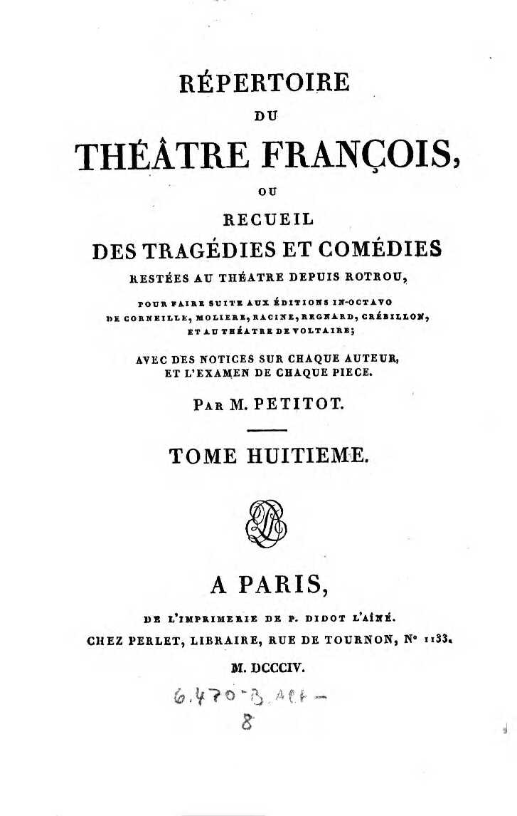 Répertoire du Théâtre François, ou Recueil des Tragédies et Comédies restées au Théatre depuis Rotrou, pour faire suite aux Éditions in-octavo de Cornéille, Moliere, Racine, Regnard, Crébillon, et au Théatre de Voltaire. Avec des Notices sur chaque Auteur, et l’Examen de chaque Piece. Tome Quinzieme. Comedies. Tome Huitieme.1804 BT: 3245 Standort: Wien – Österreichische Nationalbibliothek (ÖNB) Signatur: 6470-B.15