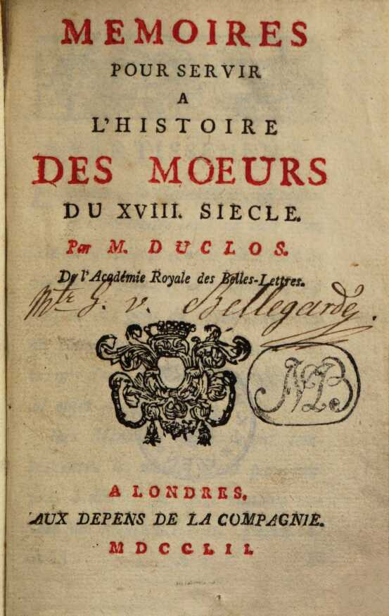 Mémoires pour servir à l’histoire des moeurs du XVIII. siècle.1752 BT: 5163 Standort: Wien – Österreichische Nationalbibliothek (ÖNB) Signatur: 41300-A