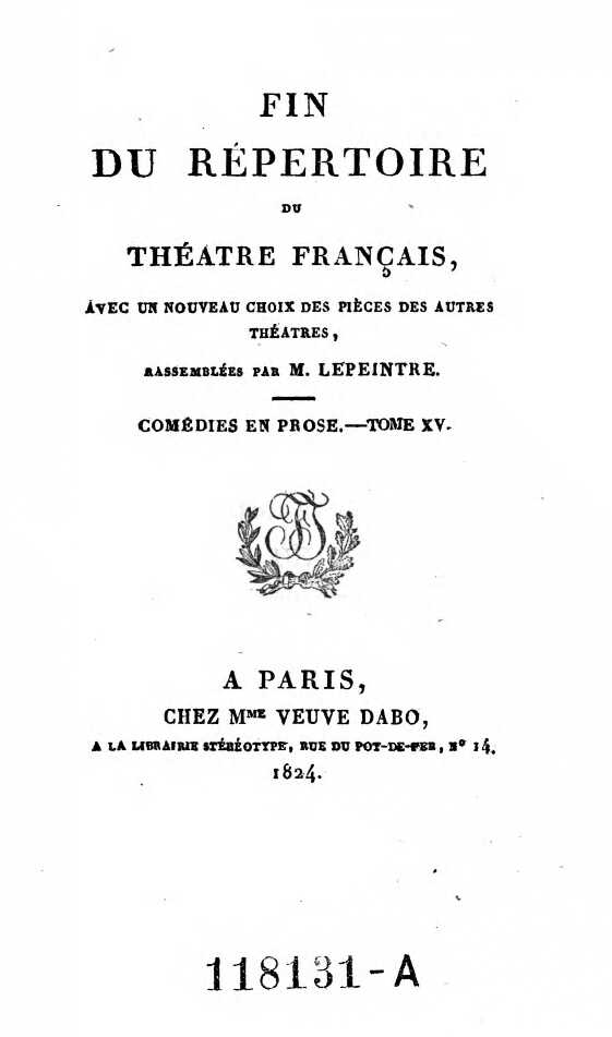 Fin du répertoire du théatre français, avec un nouveau choix des pièces des autres théatres. Comedies en prose - Tome XV.1824 BT: 3246 Standort: Wien – Österreichische Nationalbibliothek (ÖNB) Signatur: 118131-A.Fin25