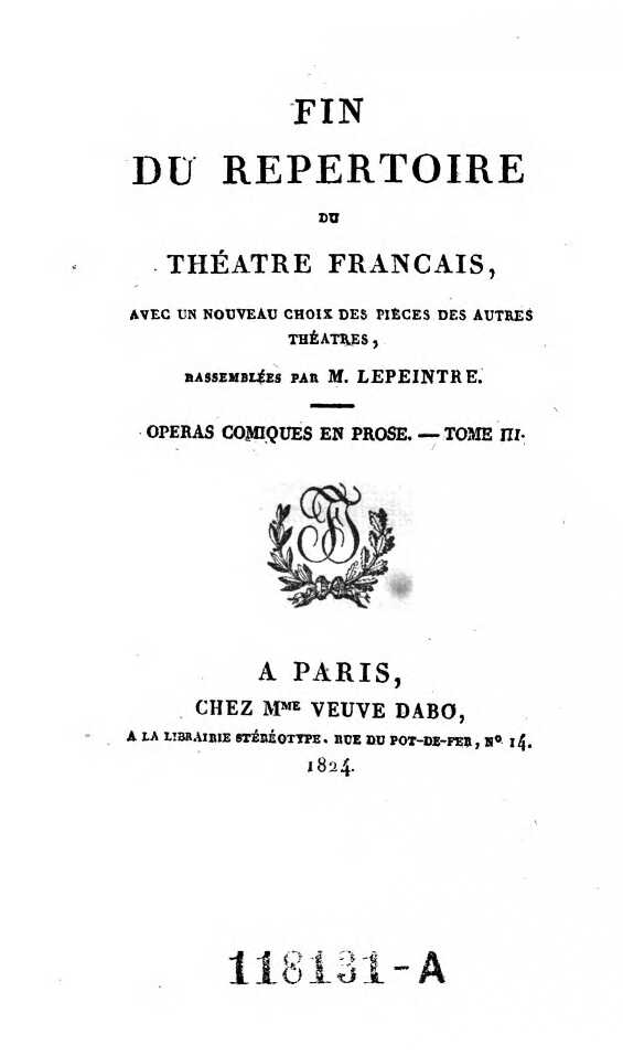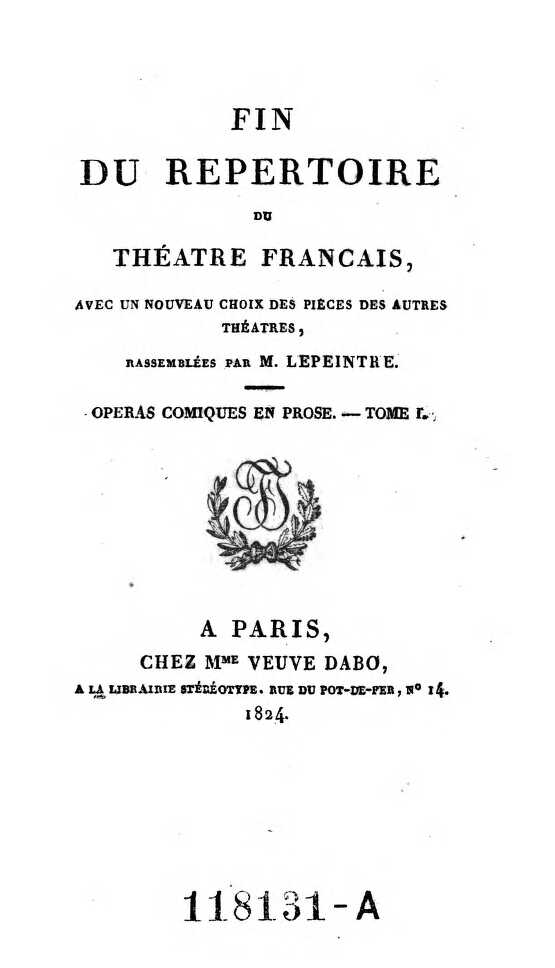 Fin du répertoire du théatre français, avec un nouveau choix des pièces des autres théatres. Operas comiques en prose. Tome I.1824 BT: 3246 Standort: Wien – Österreichische Nationalbibliothek (ÖNB) Signatur: 118131-A.Fin28