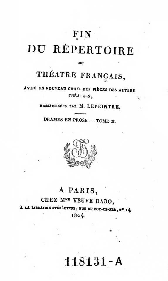 Fin du répertoire du théatre français, avec un nouveau choix des pièces des autres théatres. Drames en prose - Tome II.1824 BT: 3246 Standort: Wien – Österreichische Nationalbibliothek (ÖNB) Signatur: 118131-A.Fin41