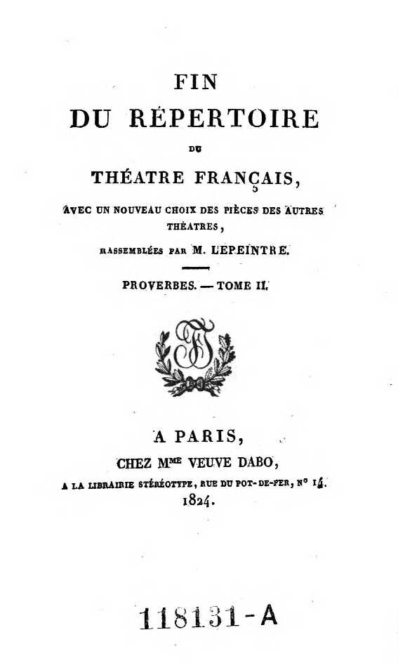 Fin du répertoire du théatre français, avec un nouveau choix des pièces des autres théatres. Proverbes - Tome I.1824 BT: 3246 Standort: Wien – Österreichische Nationalbibliothek (ÖNB) Signatur: 118131-A.Fin42