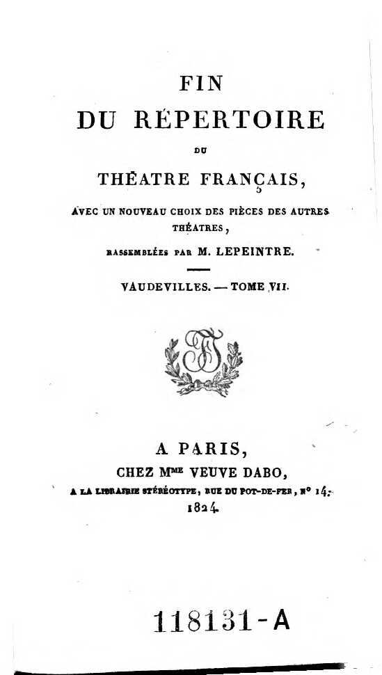 Fin du répertoire du théatre français, avec un nouveau choix des pièces des autres théatres. Vaudevilles - Tome VII.1824 BT: 3246 Standort: Wien – Österreichische Nationalbibliothek (ÖNB) Signatur: 118131-A.Fin38