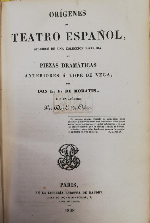 Tesoro del Teatro Español desde su orígen (año de 1356) hasta nuestros dias. Tomo Primero. Orígenes del Teatro Español, por D. L. F. de Moratin. Piezas Dramáticas anteriores á Lope de Vega.1838 BT: 2795 Standort: Halle - Universitäts- und Landesbibliothek Halle Signatur: Dk 771 (1=10)
