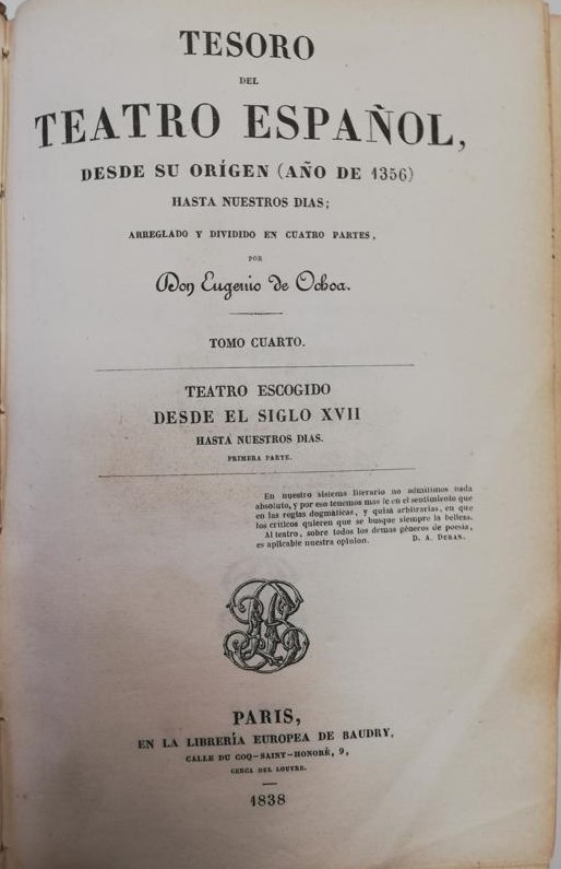 Tesoro del Teatro Español desde su orígen (año de 1356) hasta nuestros dias. Tomo Cuarto. Teatro Escogido desde el Siglo XVII hasta nuestros dias.1838 BT: 2795 Standort: Halle - Universitäts- und Landesbibliothek Halle Signatur: Dk 771 (4=13)