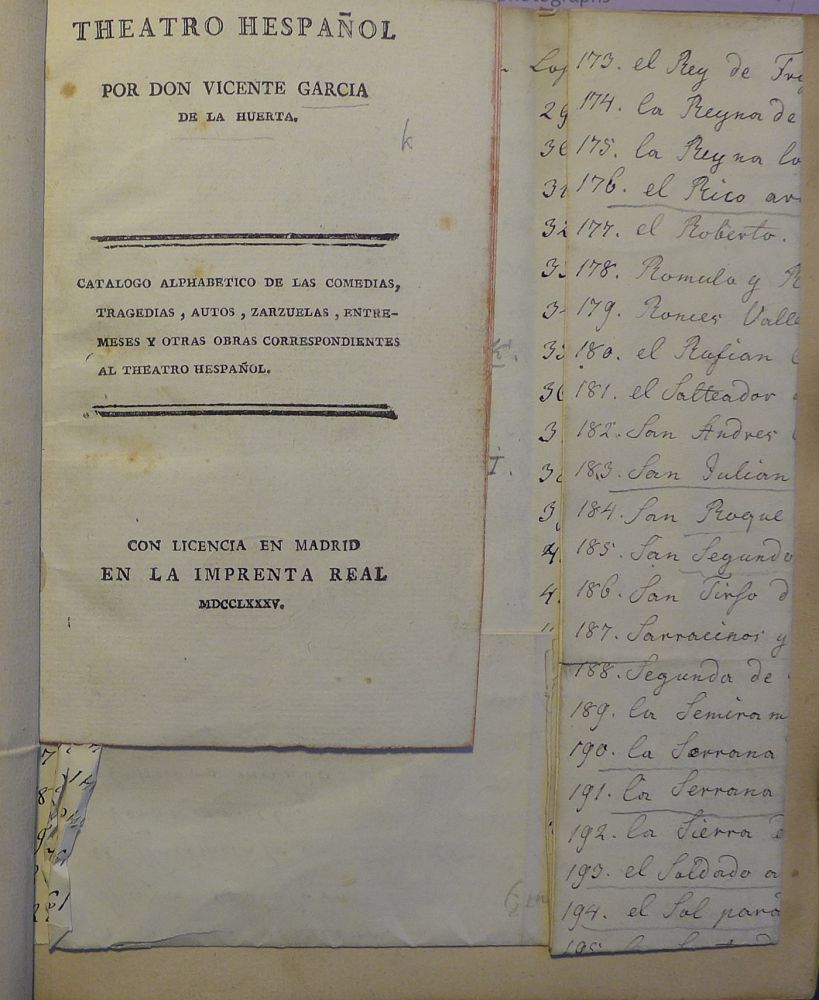 Theatro Hespañol. Catalogo alphabetico de las comedias, tragedias, autos, zarzuelas, entremeses y otras obras correspondientes al theatro hespañol1785 BT: 2802 Standort: London - British Library Signatur: C.182.aa.6. Schlüssel: 2802c