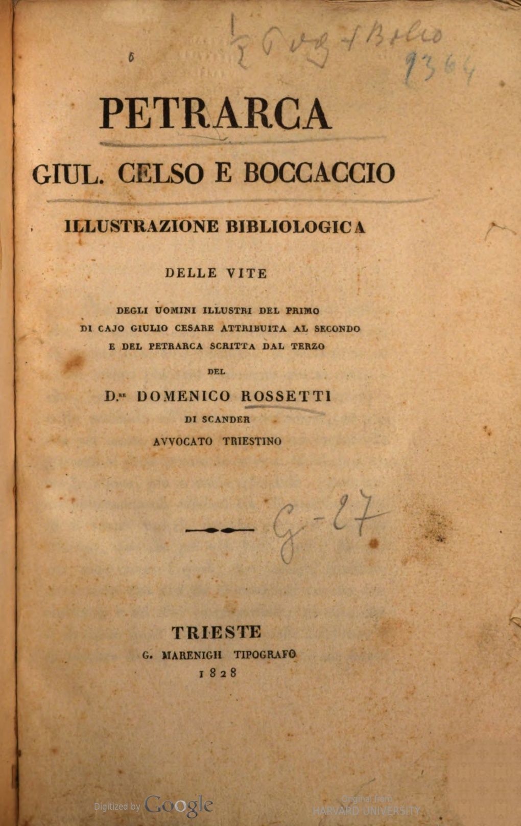 Petrarca, Giul Celso e Boccaccio. Illustrazione bibliologica delle vite degli uomini illustri [...].1828 BT: 6906