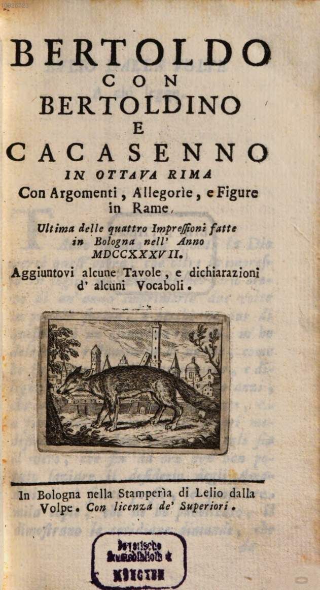 Bertoldo con Bertoldino e Cacasenno. In ottava rima con Argomenti, Annotazioni, e Figure in Rame.1737 BT: 3499