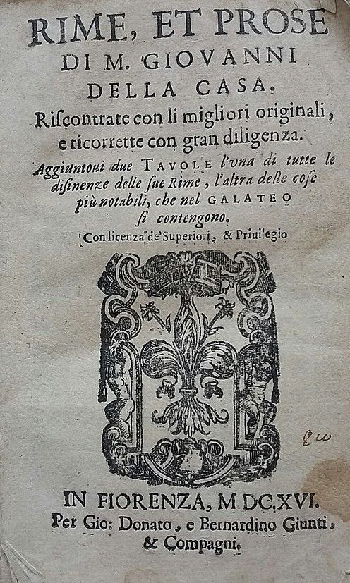 Rime e prose. Riscontrate con li migliori originali e ricorrette con gran diligenza. Aggiuntovi due Tavole, l'una di tutte le disinenze delle sue Rime, l'altra delle cose più notabile, che nel Galateo si contengono.1616 BT: 3599 Schlüssel: 3599a