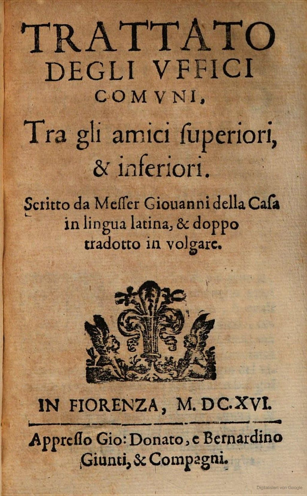 Trattato Degli Vffici Comvni. Tra gli amici superiori & inferiori. Scritto in lungua latina, & doppo tradotto in volgare.1616 BT: 3599 Schlüssel: 3599c