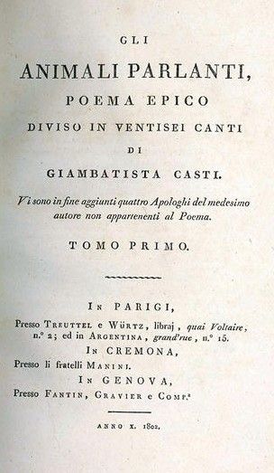 Gli animali parlanti. Poema epico diviso in ventisei canti. Vi sono in fine aggiunti quattro apologhi del medesimo autore non appartenenti al poema.1802 BT: 3604
