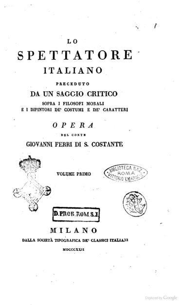 Lo Spettatore italiano. Preceduto da un saggio critico sopra i Filosofi morali e i depintori de´ costumi e de´ caratteri.1822 BT: 3704