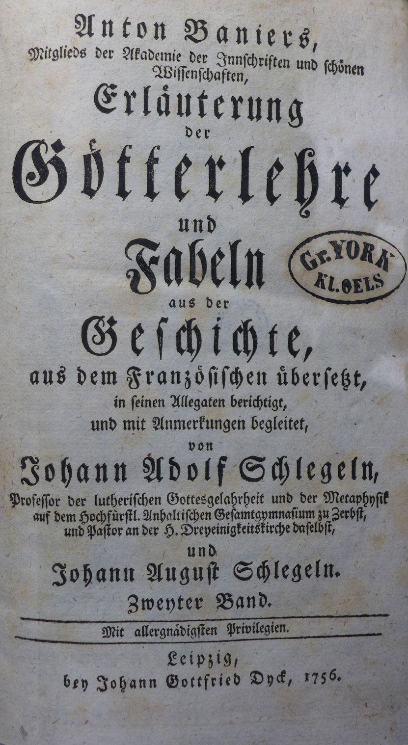 Erläuterung der Götterlehre und Fabeln aus der Geschichte. Aus dem Französischen übersetzt, in seinen Allegaten berichtigt, und mit Anmerkungen begleitet.1756 BT: 7164 Standort: Breslau - Universitätsbibliothek Wrocław Signatur: 035961