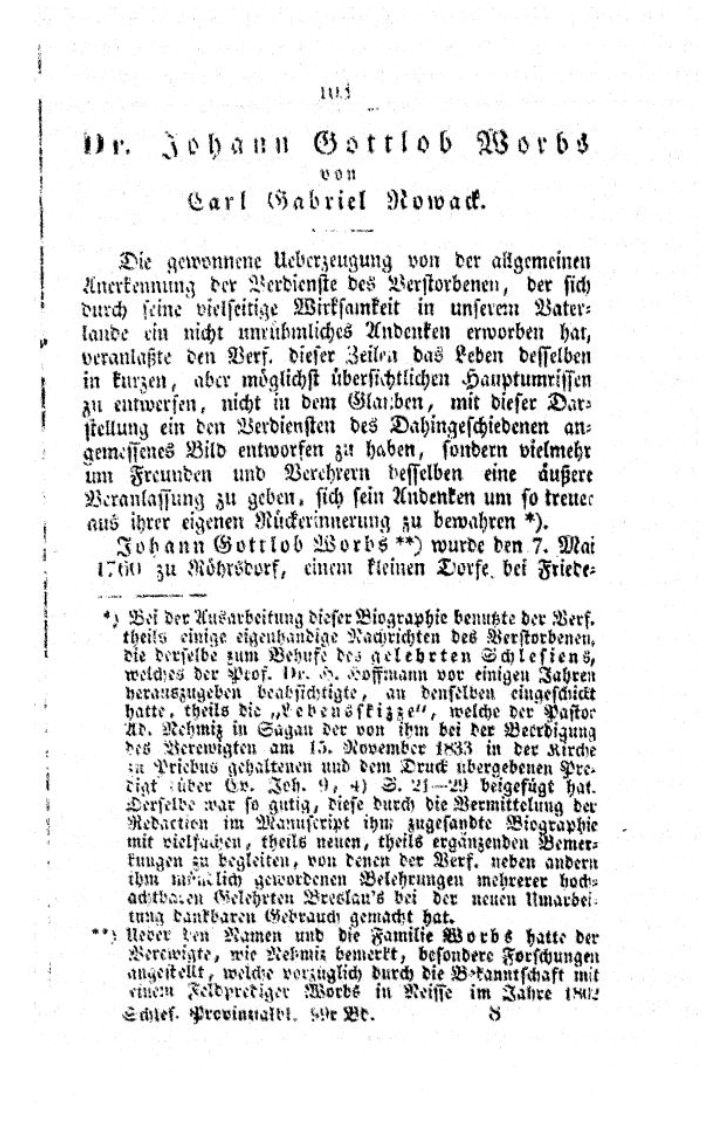 Dr. Johann Gottlob Worbs, Superintendent der K. ?Preuß. Ober-Lausitz und des Fürstenthums Sagan, Ritter des K. Pr. rothen Adlerordens 3. Kl., biographisch dargestellt.1834 BT: 5989 Standort: London - British Library Signatur: 4885.a.38.